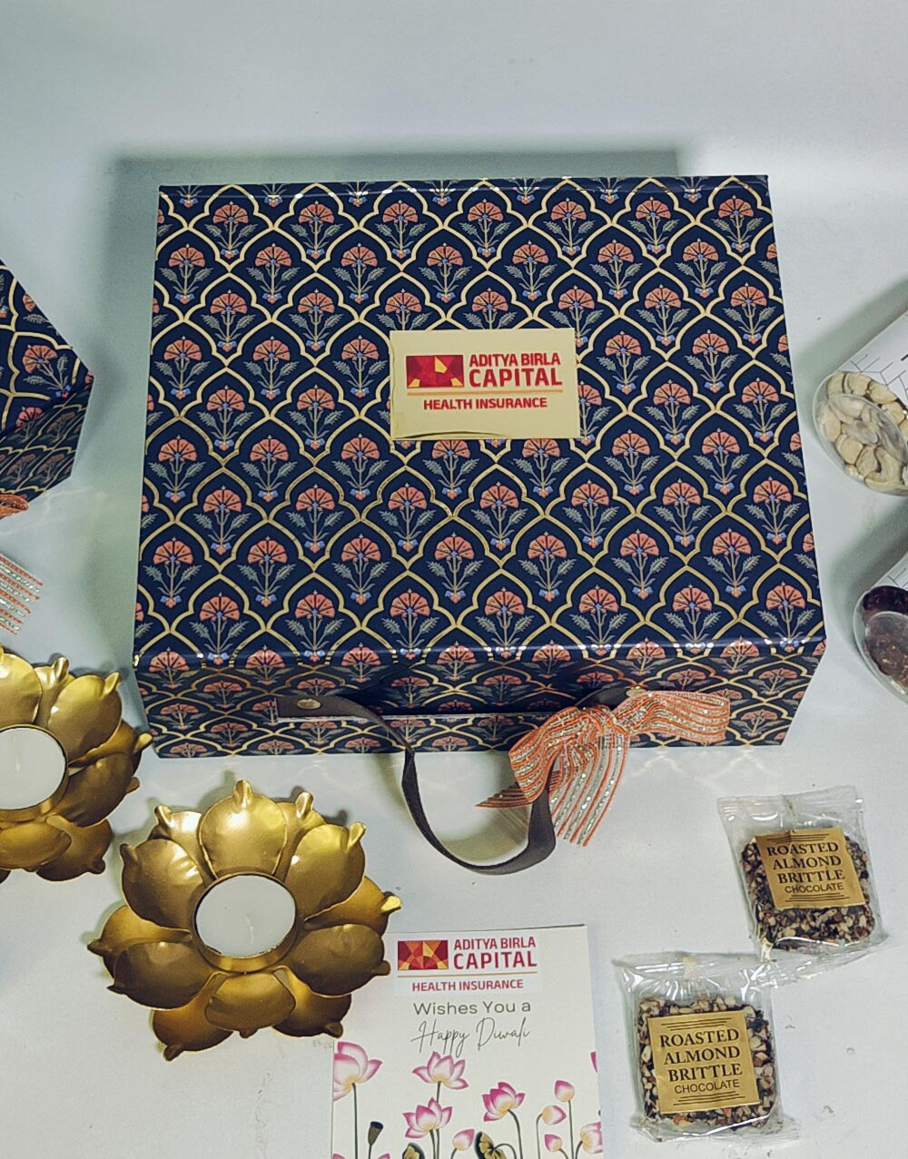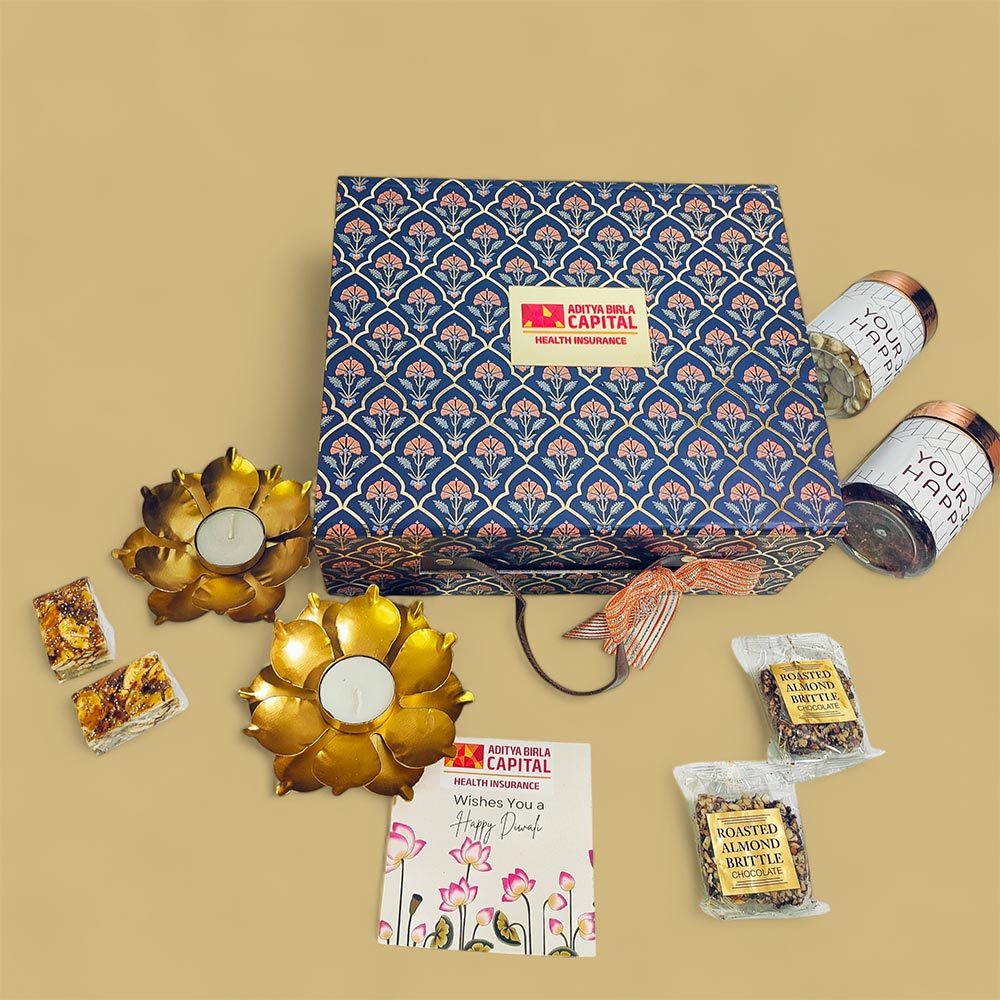 Traditional Gold Foil Box: Elegant packaging with a gold foil finish. Lotus Metal T-Light: A beautifully designed Lotus-shaped T-light holder. Date Gulkand Bites (3 Pcs): Sweet dates and rose petal jam for a delightful treat. Almond Brittle (3 Pcs): Crunchy, sweet almond brittle for a satisfying snack. Jar of Happiness (Masala Cranberry): Tangy cranberries with aromatic spices. Jar of Happiness (Almonds): Roasted almonds, lightly seasoned for a delicious crunch. Greeting Card: Personalize your gift with a lovely card.